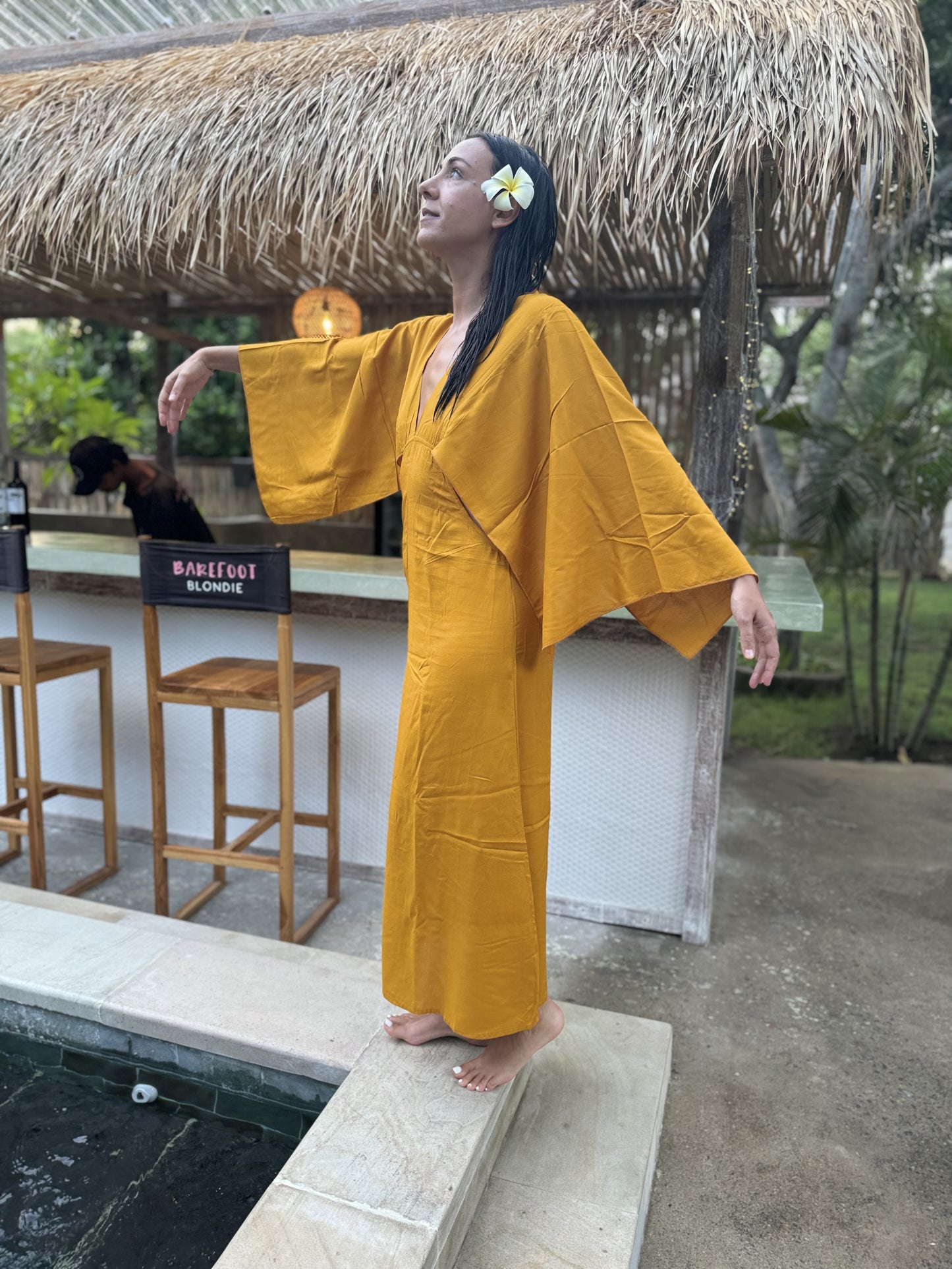 The Aiyra Dress is the definition of freeform femininity. Handmade in Brazil, this resort‑ready piece features a plunging V neckline and back, bold open sleeves, and a cut‑out waist that adjusts with a delicate tie. Crafted in soft, breathable viscose, its draped silhouette flows like wind — fluid, sensual, and grounded. Designed to move with your body, Aiyra is a full‑length, unlined style available in Black, Mustard, Beige, and Red. Wear it barefoot on sun‑warmed stone or layered with bold gold and confidence. Wild, feminine, and timeless — a dress that speaks for your soul.